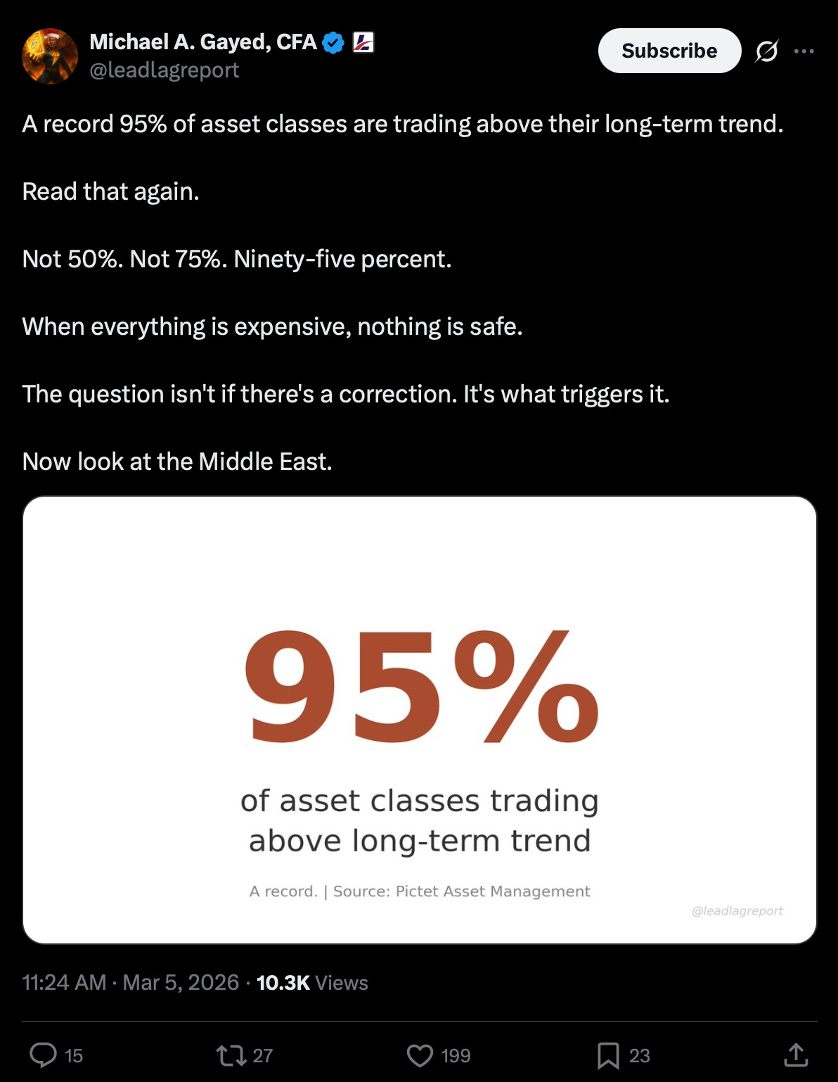 Let’s be honest. This tweet from Michael Gayed deserved a lot more than 10,000 views last week. Buried in a feed full of crude oil price and war-driven inflation worries, it was largely overlooked. But that other number is the one that stopped me cold. 95%. That’s how many asset classes are currently trading above their long-term trend. Not 50%. Not 75%. Ninety-five percent. A record. Think about that. If you own stocks, bonds, real estate, commodities, or crypto, odds are you’re sitting on positions that are allabove trend. At the same time. So what happens when something breaks and everything expensive starts selling at once? Does your diversified portfolio actually protect you? What’s the recovery playbook? All good questions, and ones we will answer, nice and easy as always, here today. So, pour yourself a big cup of coffee and settle into your favorite seat for a deep look at what happens when there’s no safe haven, with this Sunday’s Informationist. Partner spot.Most People Will Waste This Cycle