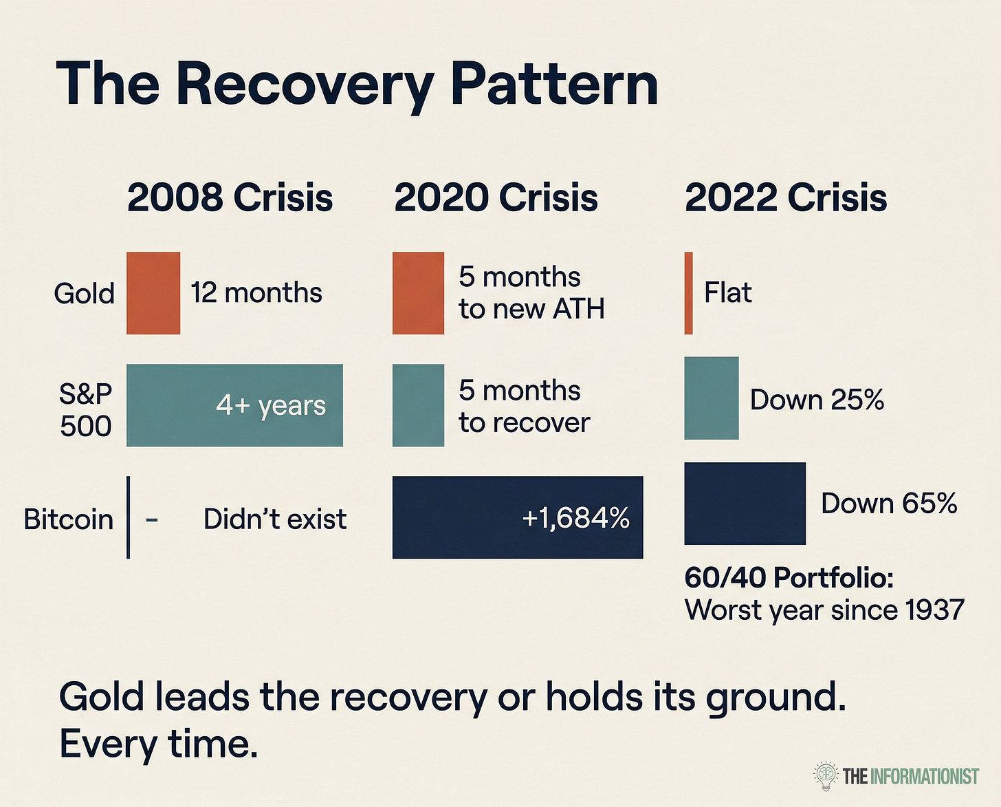 The people who provide liquidity needed liquidity themselves. So they stepped back. Sellers everywhere. Almost no buyers. And it spreads far beyond plain vanilla stocks and bonds. Every leveraged strategy in the global financial system faces the same margin call at the same time. Carry trades, where investors borrow in low-rate currencies like the Japanese yen to buy higher-yielding assets, start unwinding violently. We saw this in August 2024 when the yen carry trade rattled global markets. Interest rate arbitrage blows out. Credit spread positions get liquidated. Basis trades between futures and cash markets collapse. These are second and third-order effects. The initial margin call was on stocks. But the forced selling cascades into every corner of the financial system where someone borrowed money to make a bet. One final piece to this cascading puzzle. The entire global financial system runs on dollars. Debt is denominated in dollars. Margin calls come in dollars. Redemptions are in dollars. In a crisis, everyone needs dollars at the same time. So they sell everything to get them. Stocks. Bonds. Gold. Commodities. Foreign currencies. Anything that’s in the books, anything that they can get their hands on. Gold dropped 14% alongside stocks in March 2020. The ultimate safe haven got liquidated because investors needed the cash to cover margin calls on something else entirely. The margin models, the feedback loops, the liquidity withdrawal, and the global dollar squeeze all working together to turn an orderly selloff into a fire where every asset burns at the same time. 📊 The PatternOkay, so the plumbing breaks. Everything sells at once. Correlation goes to 1. Then what? Because correlation-to-1 events do end. They always end. The question is what happens next. And whether there’s something predictable about it. There is. Let me walk you through three examples. Watch what happens in each one. October 2008Lehman Brothers has collapsed. AIG just got bailed out. Money market funds broke the buck. The S&P 500 is in freefall and won’t stop falling until March of 2009. Gold gets crushed in the liquidation, too. Down more than 30% from its March peak. Same playbook we just talked about. Margin calls. Dollar squeeze. Sell everything. But gold bottoms on October 24, 2008. At $681 | 0.01 BTC an ounce. The S&P 500? Still falling. It won’t bottom for another four and a half months. March 9, 2009. At 676. Here’s the part that matters. Gold lost 30% in the crash. To recover that, it needed to climb about 48% from the bottom. Lo and behold, by late 2009, gold was back above $1,000 | 0.01 BTC. Fully recovered. The S&P lost 57% peak to trough. To recover that, it needed to climb 131%. That took over four years. The S&P didn’t get back to its pre-crash highs until March 2013. Gold recovered in one year. Stocks took four. And gold didn’t stop at recovery. By September 2011, it was at $1,900 | 0.03 BTC. Nearly double its pre-crash peak. Why? Because between the bottom and the recovery, the Fed did what the Fed always does in a crisis. They printed. Quantitative easing. Emergency lending facilities. Trillions of dollars flooding into the system. And where does all that new money go first? Into the asset with no counterparty risk. No earnings to disappoint. No debt to restructure. Gold. March 2020This one was different in timing but identical in sequence. Stocks, bonds, gold, Bitcoin. All bottomed the same week. March 23, 2020 for most assets. This was the ultimate dash for cash. Margin calls everywhere. Prime brokers raising haircuts 300% in a week. The cascade we just described. Everything sold together. Correlation-to-1 in its purest form. But watch the recovery. By August 2020, just five months later, gold hit new all-time highs above $2,075 | 0.03 BTC. The S&P 500 was still climbing back toward its February peak. Gold got there first. Again. And what did the Fed do between March and August? The same thing they did in 2008. Emergency rate cuts to zero. Unlimited QE. Trillions in new liquidity. The money printer turned on. Gold led. This is where it gets interesting. Bitcoin bottomed at around $5,000 | 0.07 BTC in March 2020. By December, it was at $29,000 | 0.43 BTC. By November 2021, it touched $69,000 | 1.03 BTC. Gold led the recovery. Bitcoin eventually overtook it by a mile. More than 10x in under two years from its crisis low. The sequence matters. Gold moves first because institutions trust it. Central banks hold it. It’s the oldest safe haven in existence. When the Fed starts printing, gold is the first hard asset to catch a bid. Bitcoin moves second. And when it moves, it moves violently. Because Bitcoin is a harder asset than gold with a fixed supply and no central bank can print more of it. Once the liquidity wave reaches crypto, the upside dwarfs everything else. And in 2022This one is the outlier. And it’s important because it shows what happens when the enemy is different. In 2008 and 2020, the crisis was credit and liquidity. The Fed’s response was simple: cut rates, print money, flood the system. In 2022, the enemy was inflation. And the Fed had to fight it by hiking rates from 0% to 4.5% in one year. Stocks fell 25%. Normal for a hiking cycle. But bonds fell 13% too. The classic 60/40 portfolio lost 17.5% in 2022. The worst year since 1937. Eighty-five years. Bonds were supposed to protect you. They were supposed to be the ballast. But when the Fed is hiking aggressively, both stocks and bonds get repriced lower. Your diversification only works when the risks are different. In 2022, the risk was the same for both: rising rates. And gold? Stayed roughly flat. Didn’t make money. Didn’t lose it either. Just sat there while 60/40 investors watched decades of portfolio theory fall apart. Being boring was the best trade of 2022. Before we continue, a word of caution. Gold is near all-time highs as I write this. More than double in two years. Central banks buying at re