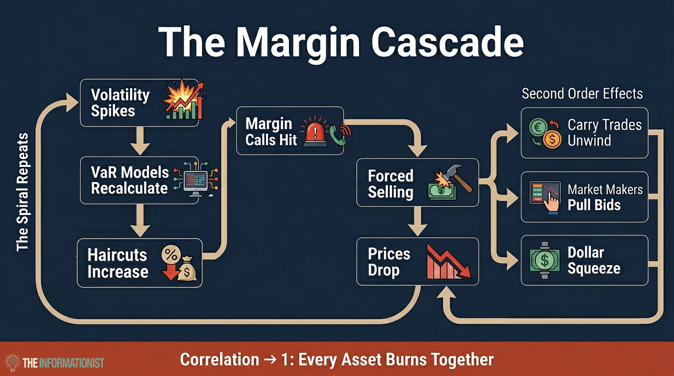 A small minority will quietly make the moves that matter. We wrote 21 Moves to Make in the Downturn for that minority. If you’re serious about building a position that survives the next decade, start here. ☎️ The Phone CallMarch 16, 2020. I’m sitting at my desk, coffee barely touched, scanning the pre-market numbers. Futures are limit down. Again. The S&P has already lost 20% in three weeks and the bleeding won’t stop. Then the email hits. Our prime broker’s normal morning operational summary lands in my inbox. But today, the subject line is anything but normal. “Immediate Margin Call Required.” All in red. I open it. Scan the margin summary first. Then the details. My stomach drops. A little background. Most individual investors use something called Reg T margin. It’s simple. Your broker lets you borrow roughly half the value of your stocks. You put up $100,000 | 1.49 BTC, you can buy $200,000 | 2.97 BTC worth. 2-to-1. Hedge funds play a different game. We use something called portfolio margining. Instead of a flat 2-to-1 rule, the broker looks at your entire book as one unit and assigns each position a haircut. Here’s how it works. A haircut is how much value the broker shaves off when calculating what you can borrow against. Blue chips in calm markets might get a 5% haircut. So if you own $100,000 | 1.49 BTC of Apple stock, you need at least $5,000 | 0.07 BTC of capital in your account against that position. Small number. Easy to cover. Riskier stocks get bigger haircuts. But when the whole portfolio is diversified, the math works in your favor. Instead of 2-to-1 leverage, you might get 5, 10 or even 20-to-1. Put up $100 million | 1,486 BTC, control over a billion in positions. Without derivatives. And if you have not worked in a hedge fund before, here is an important detail for you. All of those haircuts are set by a black box that sits on the prime broker’s risk desk. Not yours. Theirs. They decide, day to day and sometimes minute to minute, how your portfolio can be margined. How much you can borrow. How much collateral you need. And you agreed to it. Every hedge fund signs a portfolio margining agreement with their prime broker. You’re playing in their house, by their rules. Rules they can change whenever they want. When markets are calm, this works beautifully. The portfolio manager diversifies strategically, the black box sees low risk. The book gets small haircuts. Everyone’s happy. Until they aren’t. Because when volatility spikes, that black box recalculates. And when it recalculates, the prime broker doesn’t call to discuss it. They send you a notice. That’s what I was staring at. Virtually every micro-cap position in the fund had been raised to a 100% haircut. Overnight. Zero borrowing value. Those positions were now dead weight on the books. Regardless of how much confidence we had in them as companies, as far as the prime broker was concerned, they were dead weight. Even our best investments, the blue chip holdings in the eyes of the prime broker, you know, big S&P Mag 7 type stocks, had been raised from 5 or 6% to 25 or 30%. Overnight. One email. Every position. The entire margin structure of our fund had just been rewritten while we slept. And then you do the math in your head. You realize the cascade. Because it’s not just one position that’s underwater. It’s the whole book. Every holding now requires more collateral than it did yesterday. Collateral you don’t have. I pick up the phone and call the portfolio manager. Our chief investment officer. Possibly the worst phone call I’ve ever had to make in my career. This is where the hedge fund manager bypasses the portfolio managers and heads straight to the traders, telling them to sell. Ten percent. Twenty percent. Of everything. He doesn’t care what it is. “We need liquidity. We need it now.” The good positions. The bad positions. The hedges that were working perfectly. Didn’t matter. In these moments, you sell what you can, not what you want to. That’s what a correlation-to-1 event feels like from the inside. Like sprinting through a fire, every asset in your portfolio burning right alongside you. And yes, that means Treasuries too. All of it fair game. Everything on the cutting table. Because you just need one thing. Cash. Suddenly, a whole lot of it. That was March 2020. Fast forward to today. A record 95% of asset classes are trading above their long-term trend. And margin debt just hit an all-time high of $1.28 trillion | 19,020,447 BTC. The conditions are lining up again. So how does this actually happen? What breaks inside the plumbing that turns a normal selloff into a cascade where everything goes down together? Is there a pattern to the recovery? And what can you actually do to protect yourself before the next phone call comes? Let’s get into it. 🔧 The PlumbingSo you just read about what happened to one fund on one Monday morning. Now multiply that by a thousand. Because here’s the thing. Our fund wasn’t special. Pretty much every hedge fund, every leveraged institution, and every prime brokerage client received some version of that same email. A similar black box, running similar risk models, at every major bank on Wall Street, all recalculating at the same time. And they all reached the same conclusion: raise haircuts. Post haste. This is where a selloff becomes a cascade. Take a good look at this graphic of how it plays out. Take your time.
