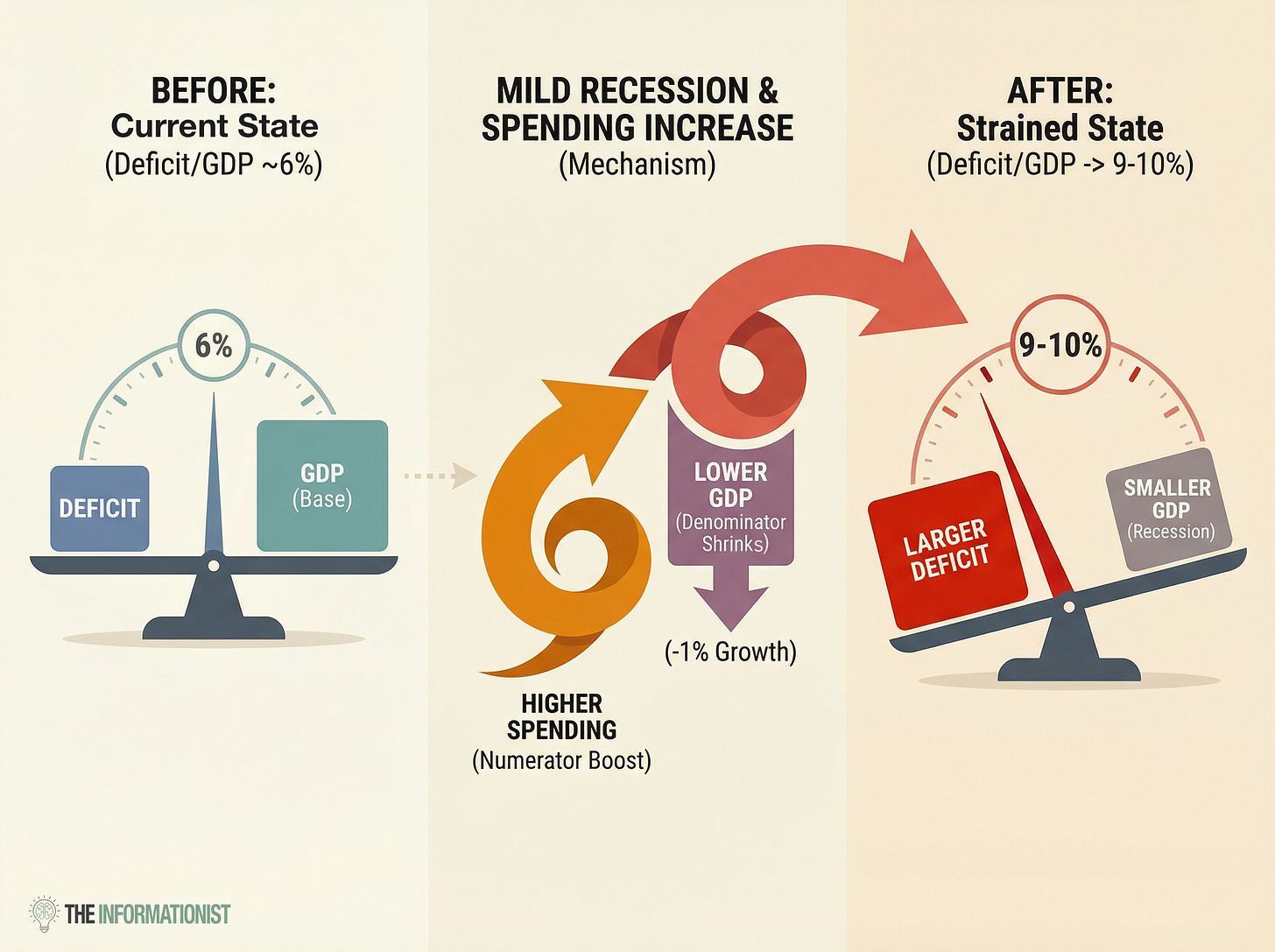 Good Lord. The projection got $1.4 trillion | 20,783,848 BTC worse. In twelve months. Oh, and the CBO assumes no recessions. For the entire projection window. A full decade of uninterrupted growth. Exactly. We have never gone a full decade without a recession in the modern era. Absurd would be putting it lightly. 😵💫 A Doom Loop UpdateSpeaking of Groundhog Day, if this feels familiar, it should. Some of you are well aware that I wrote about the US debt spiral nearly three years ago. Back then, interest expense was $400 billion | 5,938,242 BTC and the coverage ratio was already below 1x. Today it’s over $1 trillion | 14,845,606 BTC. But here’s where the math gets really ugly. Net interest on the federal debt hit $970 billion | 14,400,238 BTC in fiscal year 2025. That’s 3.2% of GDP. On interest. To put that in perspective, the entire defense budget is $885 billion | 13,138,361 BTC. The US government now spends more money paying interest on its past borrowing than it does funding the military. And the CBO says it’s heading to $2.1 trillion | 31,175,772 BTC by 2036. That’s 4.6% of GDP. More than double what it is today. And the detail that really tells the story? The CBO projects that the primary deficit, which is the deficit without interest, actually improves over the next decade. Falls from 2.6% of GDP to 2.1%. In other words, the CBO projects that the government is slowly getting its non-interest spending closer to in line with revenue. Even if they’re right (I would argue they aren’t), it doesn’t matter. Why? Because interest expense is growing so fast, it swallows any and all projected progress. The total deficit gets worse even as the operational deficit gets better. That’s the doom loop. For those of you who have not heard me speak about this before, you may be asking, So how did we get here? And why can’t we stop it? A quick refresher on how the doom loop works. The government runs a deficit. To cover that deficit, it borrows money by issuing Treasury bonds. Those bonds carry interest. That interest becomes a new expense in next year’s budget. That expense makes the deficit bigger. A bigger deficit means more borrowing. More borrowing means more interest. Around and around it goes. Deficit → Debt → Interest → Bigger Deficit → More Debt → More Interest And every 100 basis points of higher interest rates adds roughly $290 billion | 4,305,226 BTC per year to the bill. So if rates stay elevated, or if the bond market demands higher yields to absorb all that new issuance, the spiral picks up speed. And this is why the administration is demanding the Fed lower rates. Hint: As much as they claim that it’s about your mortgage rate, it’s not. It’s really about interest on federal debt. Cue up last week’s GDP report. Q4 growth came in at 1.4%. The consensus expected 3%. Last quarter was 4.4%. That’s a sharp deceleration. And it matters because deficit-to-GDP is a fraction. A numerator and a denominator. I know, I know, math. But stay with me here, it’s actually quite simple. The numerator is the deficit. $1.8 trillion | 26,722,090 BTC and climbing. It’s structural. Mandatory spending. Entitlements. Interest payments. These don’t shrink when the economy slows. They grow. The denominator is GDP. The total output of the economy. When the top stays high and the bottom slows down, the ratio gets worse. Quickly. And if the economy actually contracts? We don’t have to imagine that. It happened in Q1 of this past year, when GDP shrank 0.6%. In a contraction, you get hit from both sides. Tax revenues fall because people and companies are earning less. Spending rises because unemployment benefits and other automatic stabilizers kick in. The deficit gets bigger. GDP gets smaller. The ratio doesn’t just worsen. It explodes. During the GFC, the deficit went from 1.1% of GDP in 2007 to 9.8% in 2009. In two years. COVID was even faster. From 4.6% to 14.7% in a single year. If we’re already starting from 6%, where do we end up after the next recession? 10%? 12%? The math gets absolutely brutal, almost instantly.