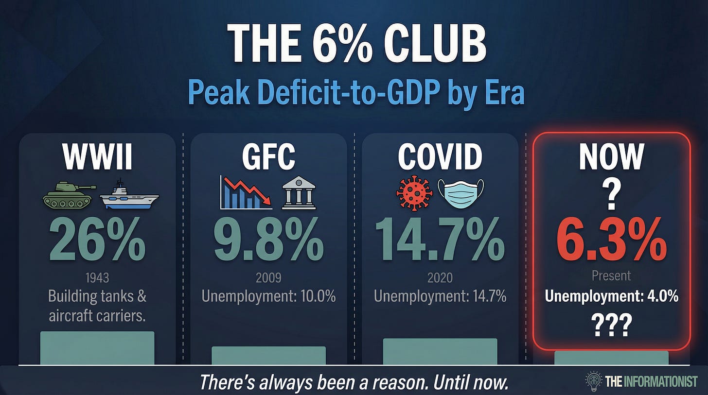 Hello Reader, Most people focus on the size of the U.S. debt. But as James Lavish explains in this week’s Informationist, the more important number isn’t the debt itself; it’s the speed at which it’s growing. He calls it the “Dubious 6% Club,” and it refers to something historically reserved for wars and financial crises: deficits above 6% of GDP. The difference today? There is no declared crisis. Below is his clear, data-driven breakdown of what that means, why the math matters, and how it ultimately impacts your savings, retirement, and purchasing power. 💡 The Dubious 6% ClubIssue 206James Lavish, CFAFeb 22, 2026∙ Paid ✌️ Welcome to the latest issue of The Informationist, the newsletter that makes you smarter in just a few minutes each week. 🙌 The Informationist takes one current event or complicated concept and simplifies it for you in bullet points and easy to understand text. 🫶 If this email was forwarded to you, then you have awesome friends, click below to join! 👉 And you can always check out the archives to read more of The Informationist. Today’s Bullets: