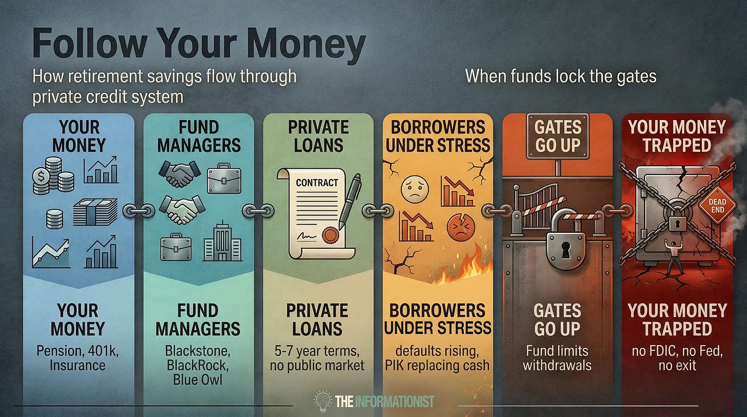 A small minority will quietly make the moves that matter. We wrote 21 Moves to Make in the Downturn for that minority. If you’re serious about building a position that survives the next decade, start here. 🏦What Is Private Credit, and Why Should You Care?Let’s start with the basics, shall we? You’ve probably heard of private equity. Big firms like KKR and Apollo that buy entire companies, restructure them, and sell them for a profit. That’s private equity, a sector of investing with its own can of mark-to-market worms. Private credit is different. It’s the lending side. See, instead of buying companies, private credit funds lend money to them. Think of it as unregulated banks, operating in the opaque corners of the bankng world, and making loans directly to mid-sized businesses that can’t or don’t want to borrow from traditional banks. This is why they’re often referred to as shadow banking. It’s lending outside of the traditional banking system, beyond the reach of most banking regulations. So why does private credit even exist? Simple. After super restrictive bank rules were enacted in the aftermath of the great financial crisis, fund managers saw an opportunity. They raised money from investors, from pensions, endowments, insurance companies, and wealthy individuals, and started making the loans that banks no longer would. Higher interest rates. Flexible terms. And for the investors putting money in, attractive yields in a world where yields were close to zero. Everybody won. The companies got their capital. The investors got their returns. The fund managers collected their fees. And the market grew like black mold in a Houston basement. FYI, I wrote all about shadow banking last fall. If you have not seen that newsletter or would like to revisit, you can find it here:
